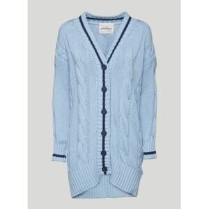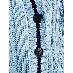 Elevate your wardrobe with this Ottod'ame long cable knit cardigan sweater in a beautiful pastel blue. Made in Italy from 100% cotton, this premium knit piece features a longline silhouette with front button closure, navy contrast trim, and ribbed cuffs. A timeless layering essential perfect for transitional weather or cozy-chic styling.