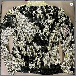 Abstract geo print (made up of “OTTO” letters) in dark green-grey, black, lime, and ivory with touches of dusty lilac; the turtleneck is lime /ivory paisley, with geo print trim, and paisley swirls spill over onto the shoulders! So beautiful and soft — unfortunately it's too small for me!