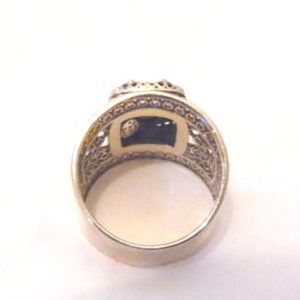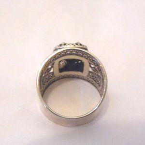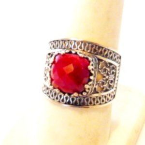 Ottoman Silver Jewelry Collection Raspberry Corundum Bold Filigree Ring Size 9. Design Information: Ring has cushion-cut Raspberry corundum solitaire at center; Crown-like bezel with round silver beads accents; Wide, open metalwork; filigree band with unique side embroidery and crown-set, cushion-cut raspberry corundum. Measurements: Approx. 11/16"L x 3/4"W x 1/4"H; shank 1/4"W; Metal Type: Sterling silver; Metal Color: White; Metal Stamp: .925; Finish: Oxidized, polished; Additional Features: Handcrafted; Country of Origin: Turkey: Stone Information: Color-Enhanced Raspberry Corundum: Cushion-cut (10x10); mined in India