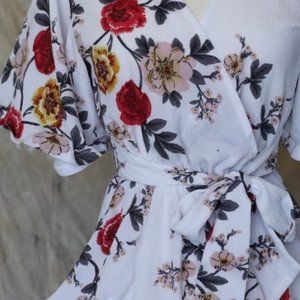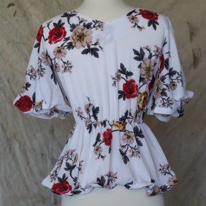 Beautiful red, ochre, and dusty rose floral on white short sleeve wrap blouse tied with a fancy bow at the waist. Made from polyester and needs to be washed gently and laid flat to dry. Size: 36/uk 8/us s. Perfect for day out or romantic date. Dress it up or down, it's still cute.