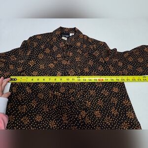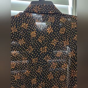 Elegant button down sheer long sleeve blouse featuring a brown floral pattern. Ideal for any occasion. ruffle down center front.