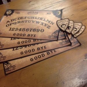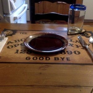 Ouija Board Table Place Mats with Wooden Coasters. Set of 4. Four table mats printed vinyl (13 oz vinyl) and four thin wooden planchette coasters. Place mats measure 12" x 18". Never been used. Dishes not included.