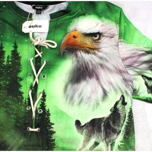 This shirt features a striking wildlife print with an eagle and wolves set against a serene forest backdrop. The lace-up neckline adds a unique touch, making it suitable for casual or themed occasions. Crafted from quality materials, it provides comfort and style with a touch of wilderness.