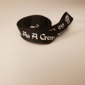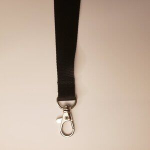 The black lanyard is 5/8 of an inch wide and about 34 inches long. There is a silver-tone lobster-claw style keychain at the bottom. The white printing is on just one side but it repeats 4 times. It is new and unworn but has no individual tag.