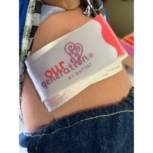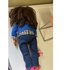 Our Generation 18-inch doll by Battat with a full set of accessories and extra outfits. Doll features brunette hair, brown eyes, and comes dressed in a blue sweater, gingham shirt, and jeans with pink sneakers. Includes multiple outfits and play accessories for creative fun.
