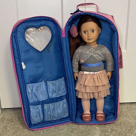 Our Generation doll Ayla in original clothing with all accessories and polka dot carrier case