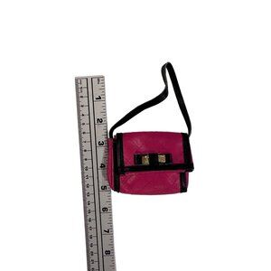 This stylish mini tote bag for dolls is designed with a vibrant pink and black quilted exterior, complete with a gold bow accent. Crafted to complement your doll's wardrobe, it offers a chic and fashionable touch to any outfit.
