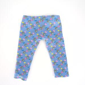 Pale blue / lilac color with brown paw prints with bright blue hearts in the middle of them and pink, red and yellow bones pattern throughout the leggings