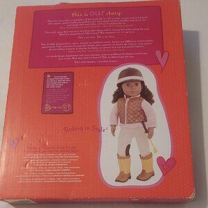 Our Generation Riding In Style Doll Outfit. 18-inch Doll Equestrian Outfit. Includes: sweater, quilted vest, jodhpur-style pants, a pair of boots, helmet, and a riding crop.