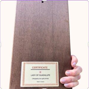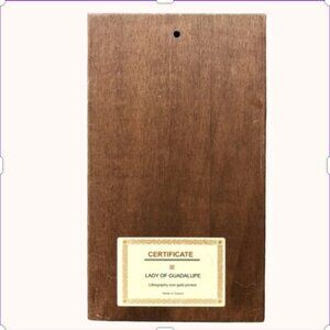 A beautiful depiction of the Lady of Guadalupe Lithography icon gold printed art on wood. The shiny gold accents make this an attractive and unique piece of art.