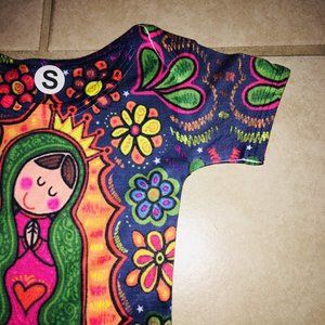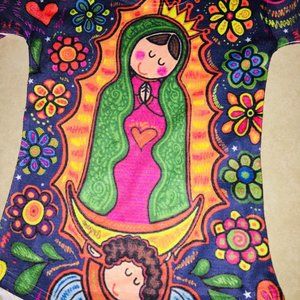 Premium cotton blend fabric, stretchy and soft. Short sleeves, round neck. Printed in HD colors with sandblasting technique. Printed on the front only. White back, not printed. These onesies are fitted, for a relaxed fit go a size up.This Model features a super cute Cartoon version of Our Lady of Guadalupe with a floral background.