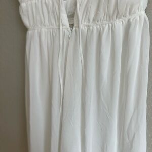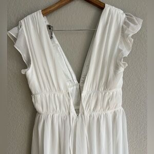 Lulus Our Love Song White Ruffled Wide-Leg Jumpsuit! This gorgeous jumpsuit is composed of gauzy, woven chiffon that creates a plunging V-neckline with short, ruffled sleeves. A pleated bodice atop a double-banded empire waist (with decorative front tie) sweeps down to breezy, wide-leg pants. Hidden back zipper/clasp.