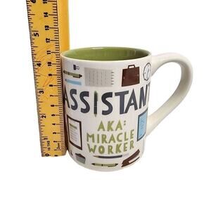 Excellent, used condition. Coffee mugs for all miracle working assistances! Tan exterior, sage green interior ceramic mug. Depicts everything "assistant" such as stapler, briefcase, pens, etc. Please see pics for details and measurements. Gently worn. Smoke-free, ask any questions. Shop my closet for more great items: BUNDLE, BUNDLE, BUNDLE for discounts!!!