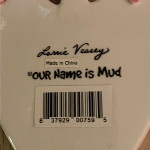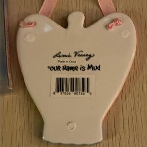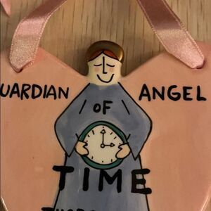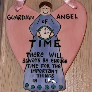 Our Name is Mud Guardian Angel of Time. New in Box. Pink and purple with black writing and pick ribbon. Colorful, hand-painted ceramic
