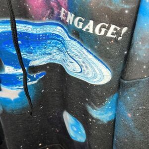 Engage your warp drive with this Star Trek hoodie! Featuring the U.S.S. Enterprise soaring through a galactic backdrop with “Engage!” embroidered above, plus the show's logo embroidered on the kangaroo pocket. Comes with a drawstring hood.