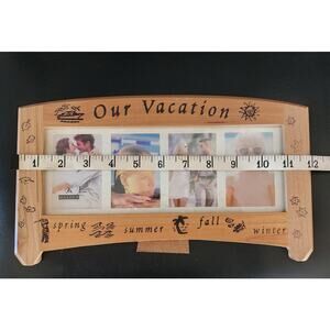 Crafted for the travel enthusiast, this Our Vacation Photo Collage Picture Frame is a charming ode to cherished memories. With a multicolored wood finish and a lodge style, it's designed to blend seamlessly into any home décor. The frame measures 12x6 inches and is tailored to fit four photos, each in a standard 2.5x3.5 inch size, creating a dynamic and eye-catching display.Functionality meets artistry in this modern-era frame, manufactured in 1993, featuring a clear glass front that protects your photos while offering a full view. The rear-loading design ensures easy photo insertion and the frame is free-standing, making it a versatile addition to your living space. Whether you're displaying snapshots from a recent trip or treasured moments from years past, this picture frame is perfect for all occasions.