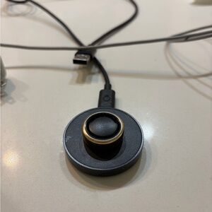 Size 8 Oura Gen 3 Gold Horizon Ring. Some wear and tear/ discoloring around as shown but can be easily fixed with a cover from Amazon. Comes with charger, works perfectly!