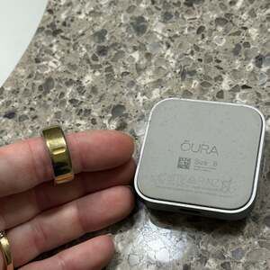 Oura Ring Gen 4 in gold, size 8, with minor signs of wear. This smart ring tracks sleep, activity, and readiness scores. Includes official Oura charger which is confirmed to be fully functional.