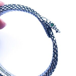 A detailed cast pewter, solid serpent bangle, (no adjustment), with small green Swarovski crystals set into its eyes.