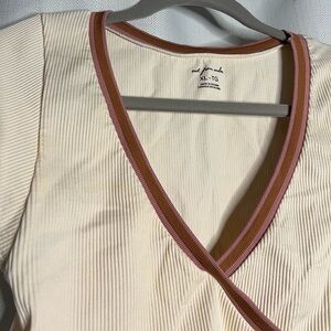 Out From Under Go For Gold Seamless Surplice Cream Ribbed Crop Top. Off white cream color with brown and blush pink stripes along the chest. Surplice style neckline. Ribbed, super stretchy fabric. Cap sleeves, crop top. Fabric tag has been cutout. Size XL.