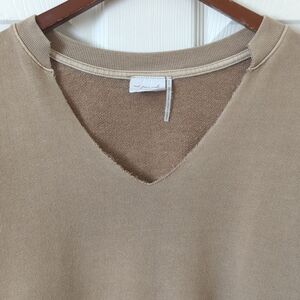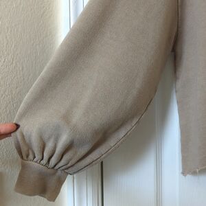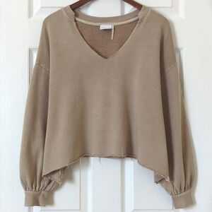 This super cute beige pullover sweatshirt features a ribbed notched v-neck, long balloon sleeves with ribbed cuffs, and a raw rolled hem with a small brand tag near the left hip. It's soft, lightweight and comfortable with an oversized, relaxed and drapey fit. Classic, casual, and high quality!