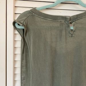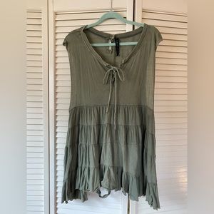 Cute Ruffle Romper - perfect for Summer! Olive green color. Tie up detail on front, button snap on back. Cap sleeve. Soft and lightweight detail. Worn a few times.