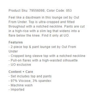 Bottoms: approx. 28-inch inseam, 11-inch rise, drawstring elastic waistband, flare leg, ribbed