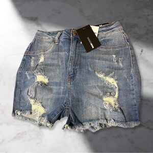New, never worn Fashion Nova Out The Friend Zone distressed denim shorts. Medium blue wash. Size M