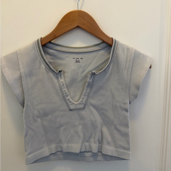 Soft ribbed cropped top in light blue. Comfortable stretch fabric with a subtle V-neck detail. Easy-to-wear style for everyday play and layering. Machine-friendly care for busy families.
