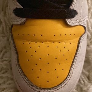 Small gruffs on side. Barely noticeable. Creases, makes shoes broken in. True to size, and comfortable. Slip on.