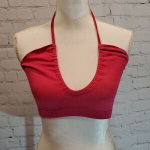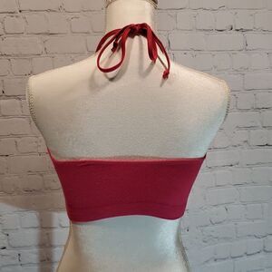 In good used condition minor overall wear. Stretchy with ribbed knit. Tie at the neck with deep u neck.