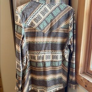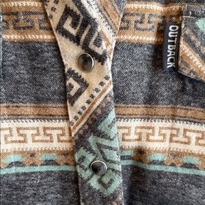 Stylish Outback shirt with an Aztec pattern. Features brown, tan, and green colors.