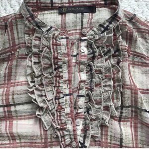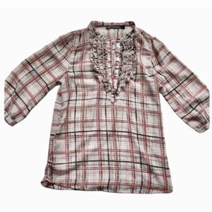 Outback Red tunic length blouse shirt. Red, cream and black plaid sheer tunic with front buttons and ruffle details. Perfect for holidays or Christmas. Very good condition. Size small.