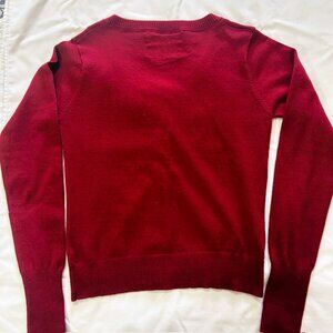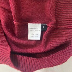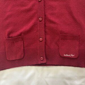 Outback Red Cardigan Ladies P Large Red Button Down Pockets Ribbon flowers. Marked Large, I think it is a PL, check measurements, hand wash, do not tumble dry not dry clean. Length 23 in, chest 36 in, 85% acylic, 15% polyester.