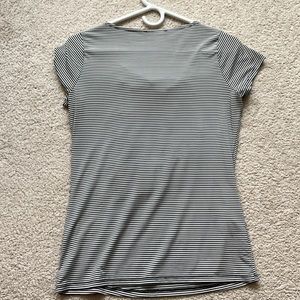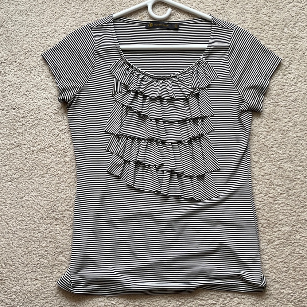 Outback Red ruffle-front blouse. Black and white stripe. Polyester & spandex.