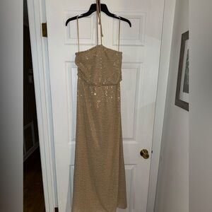 Dazzle in this strapless tan dress with shimmering sequins. Ideal for special events.