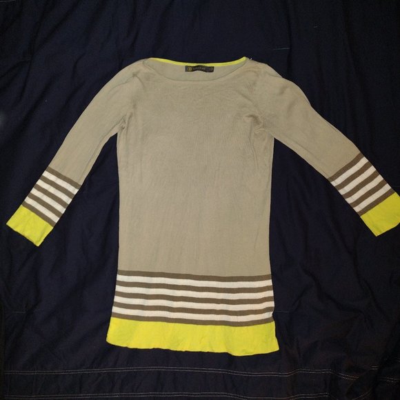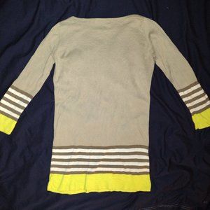 * pretty, long, soft, thin, sweater with yellow trim at wrists and waist.