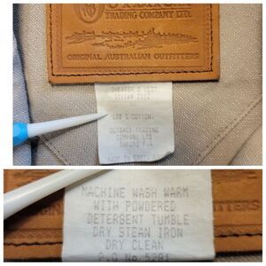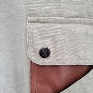 Thick and heavy khaki colored cotton canvas with reddish brown leather or faux leather trim. Tiny bit of wear pointed out on trim otherwise near perfect.