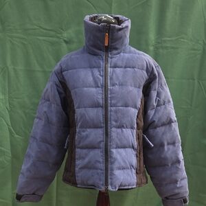 You don't have to ride a horse to appreciate this beautiful blue and black riding coat. Velvety texture and smart details take you on the trail and off in style. Heavy duty two way zipper goes all the way to neck height to keep you warm on those brisk morning rides. Hidden storm flap and goose down insulation keeps wind at bay. Adjustable sleeve cuffs snug up around your gloves, long sleeves to ensure you can excerise freedom of motion and still keep covered! Snap open the back to allow for your saddle and comfort. Two inside pockets, two outside lined pockets that zip closed. This jacket is practical, functional, beautiful and would make a great addition to your outdoor wardrobe. Used but in excellent condition.