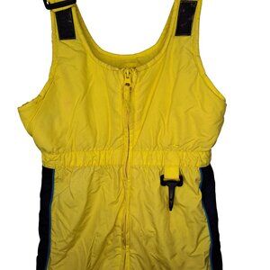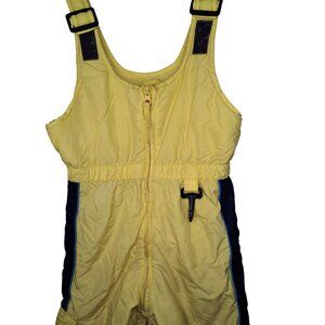 Bright yellow, bib/overalls style snow pants from Outbrook Kids, with black trim. These do have some overall discoloration, but no holes or rips. Nice bright color with adjustable shoulder straps and front zipper closure. Unisex toddler size 3T. Measures about 11.5 inches across the waist and 29 inches long (not including the straps), 14 inch inseam.