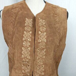 Outbrook women's vest, leather, western style, floral embroidered, hook & eye closure, lined, good condition.