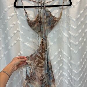 Chic halter romper with a tie-dye pattern. Features a plunging neckline and adjustable straps. Backless with waistbeads. Never worn.