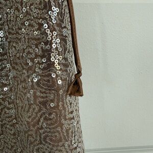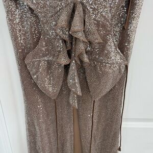 Elegant backless silver sequin dress with ruffle detail. Figure-skimming mermaid silhouette that flatters the body. Thin straps and open sides for a show-stopping evening look. Perfect for formal events and parties in silver sparkle.