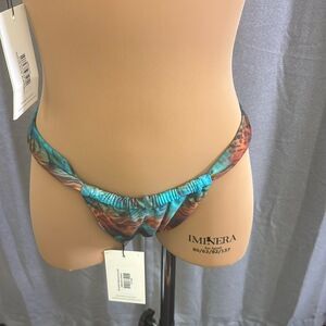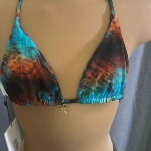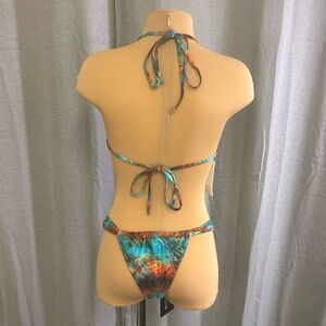 Vibrant multicolor bikini by Outcast Swim. Features a mix of blue, brown, and orange hues. Perfect for a stylish beach day.