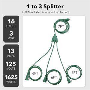 🧿Designed for Outdoor: This versatile green 3-way extension cord splitter helps use less cords to set up landscape lighting and Christmas decorations easily. With three outlets you can plug in light strings, holiday decorations, stake lights, or lawn accessories up to a total of 13 amps/1625 watts.