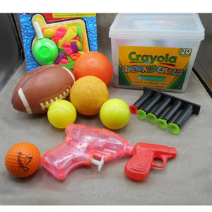 Outdoor Fun Lot: Sidewalk Chalk, Water Balloons, Balls, Water Gun. Lots of fun outdoor toys! Brand new Water Bomb Water Balloons! Crayola Sidewalk Chalk container with used chalk, several different balls, a squirt gun, and some refills for your sticky dart gun! Please see pictures.