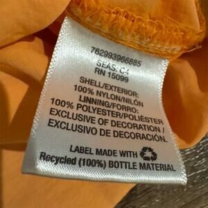 This shirt is in good preowned condition. I don't see any flaws. This is a pretty bright, almost neon coral orange color.