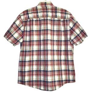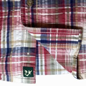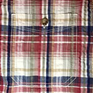 This loose fitting casual short sleeve plaid button down has a seersucker plaid pattern of white, red, navy, and tan with two buttoned breast pockets. In excellent used condition.