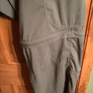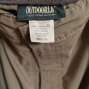 Versatile taupe pants with practical design. Ideal for outdoor activities. Zip-off legs to turn into shorts. Built-in belt with utility pockets for fishing gear. 38x30. Water resistant and comfortable around campfire at night.