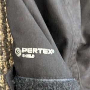 Durable performance jacket by Outdoor Research. Features a hood and multiple pockets. Red accents add style.